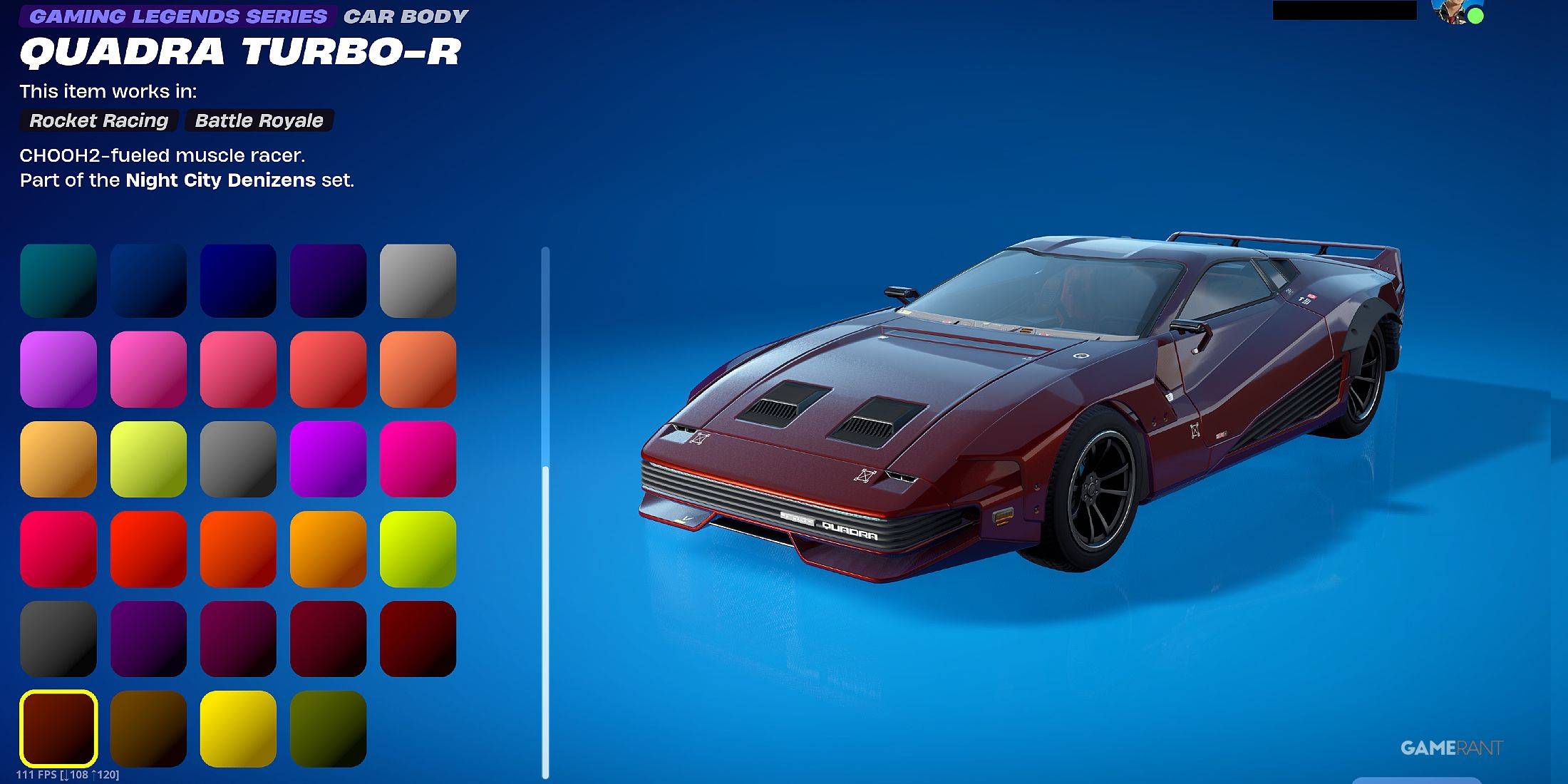 Jenseits des Quadra Turbo-R selbst bietet das Cyberpunk -Fahrzeugbündel einen Satz Räder und drei einzigartige Abziehbilder : V-Tech, Red Raijin und Green Raijin. Darüber hinaus verfügt das Fahrzeug mit 49 verschiedenen Farbstilen , um Ihre Fahrt an den Inhalt Ihres Herzens anzupassen. Nach dem Kauf kann der Quadra Turbo-R als Sportwagen in Ihrem Schließfach ausgestattet und in Fortnites verschiedenen Erfahrungen verwendet werden, einschließlich Battle Royale und Rocket Racing.