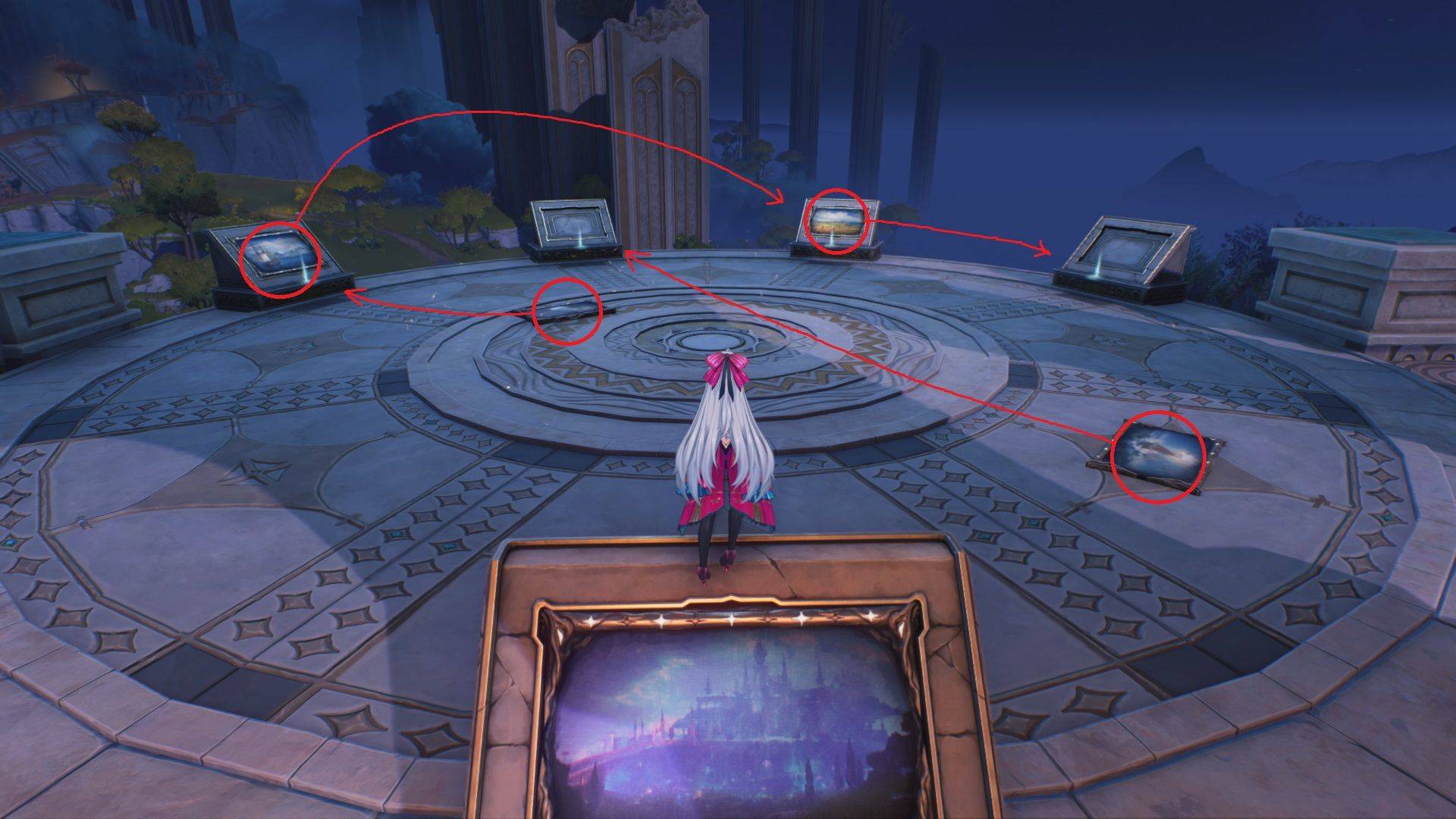 In der Prüfungen der alten Quest müssen Sie vier verschiedene Prüfungen in der Nähe von Porto-Veno-Schloss im östlichen Teil von Thessaleo Fells abschließen. Einer dieser Versuche, der Versuch der Weisheit, zeigt ein weiteres Morph -Malrowzle. Das Ziel hier ist es, die Gemälde auf den Sockeln zu arrangieren, um eine zusammenhängende Geschichte von links nach rechts zu bilden. Die Lösung wird im Bild oben dargestellt.
