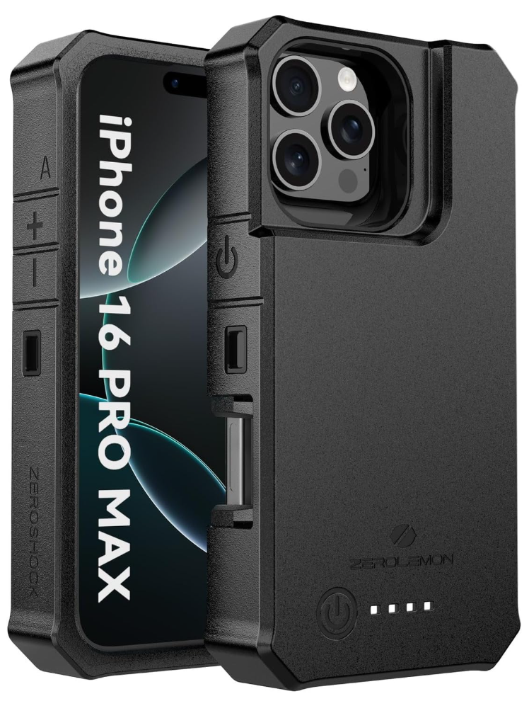0Ensure your iPhone 15 Pro Max stays safe and charged with this rugged case, featuring two 5,000 mAh batteries and military-grade protection. See it at AmazonProduct SpecificationsCapacity10,000 mAh (2 x 5,000 mAh)Size6.74" x 3.48" x 0.99"Weight8.5 ouncesPROSMilitary-grade protection and shockproofingSupports 18W fast chargingCONSNo data passthrough The iPhone 16 Pro Max's 4,685mAh battery is substantial, but for intensive use like Cinematic Mode or gaming on Apple Arcade, extra power is beneficial. ZeroLemon's battery case provides peace of mind with its two 5,000mAh batteries, offering about 1.5 additional charges. LED indicators show the charging status and battery levels.