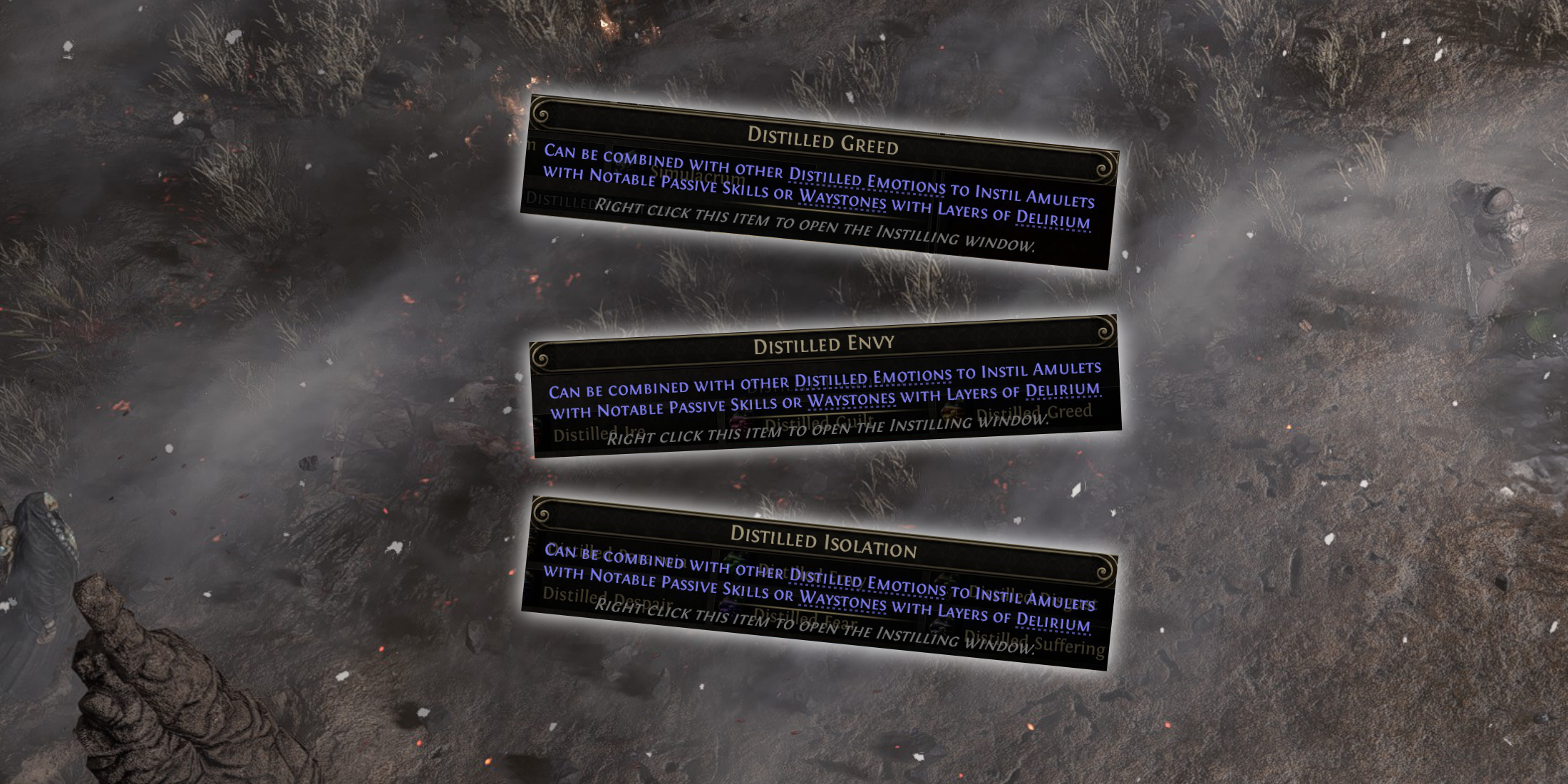 Os inimigos afetados pelo nevoeiro do delírio soltam emoções destiladas. Os chefes também os lançam frequentemente. Essas moedas unzem os amuletos com habilidades passivas notáveis, eliminando a necessidade de investimento passivo de ponto de habilidade.
